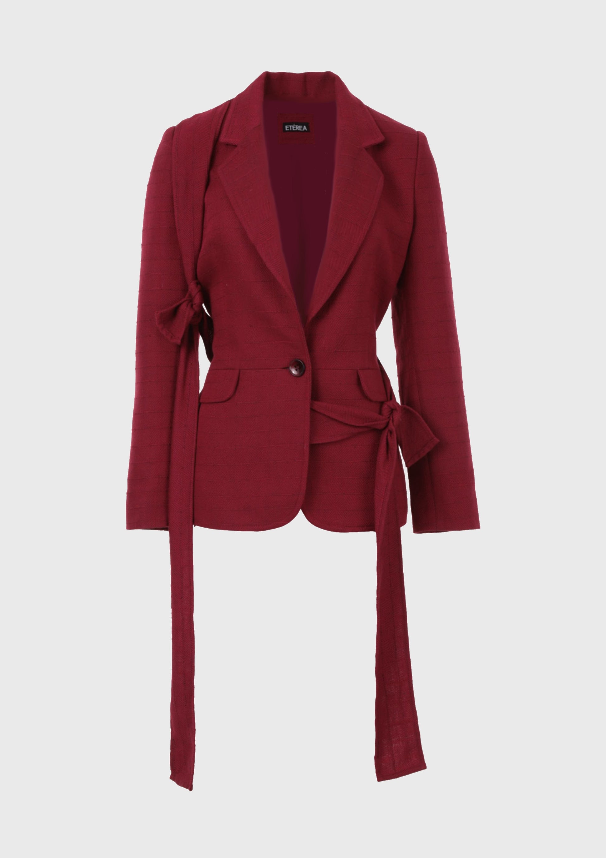 Blazer color vino en algodón, con forro, bolsillos de tapa y nudos en delantero y espalda.