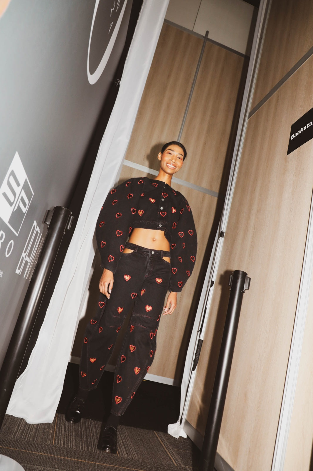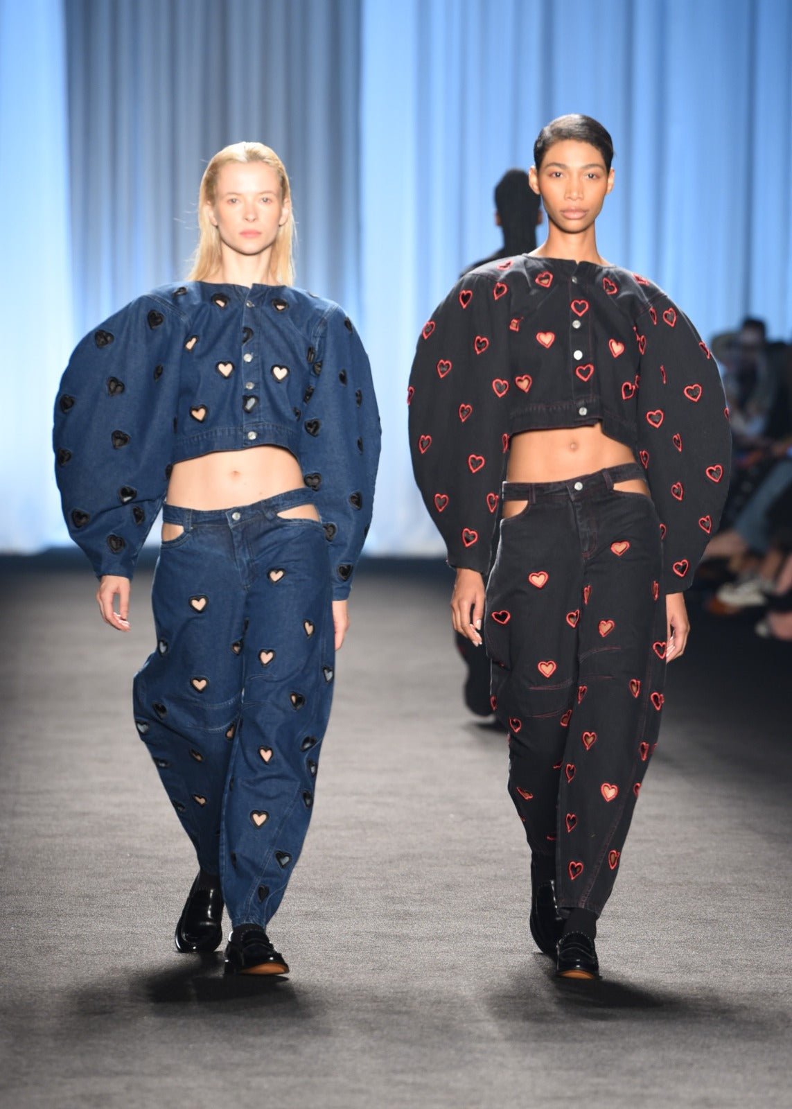 Jeans negros tiro medio con bordado de corazones rojos, aberturas en los bolsillos delanteros y bolsillos con forma de corazón.