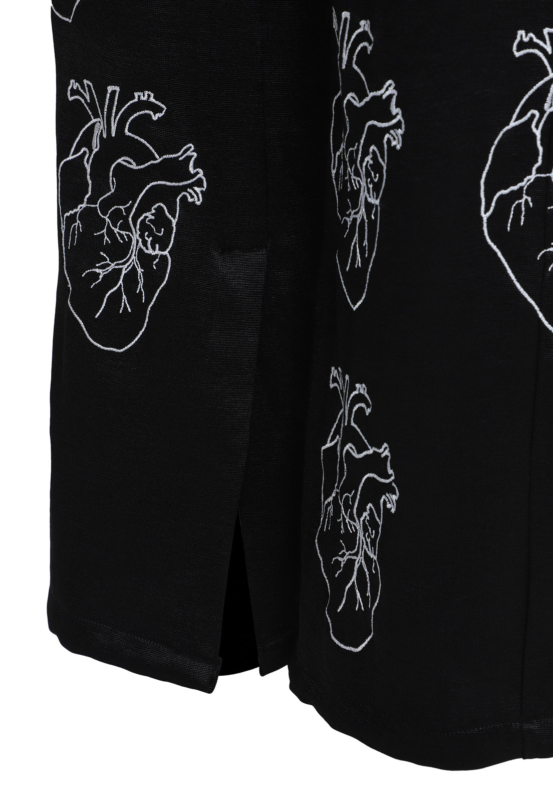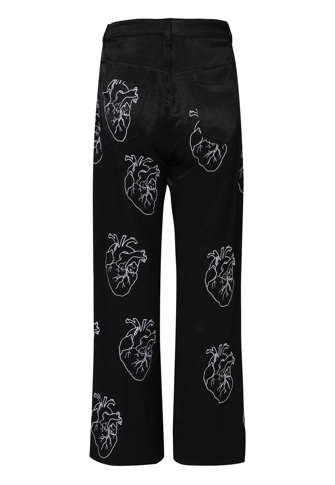 Pantalón negro recto tipo baggy con corazones anatómicos bordados.