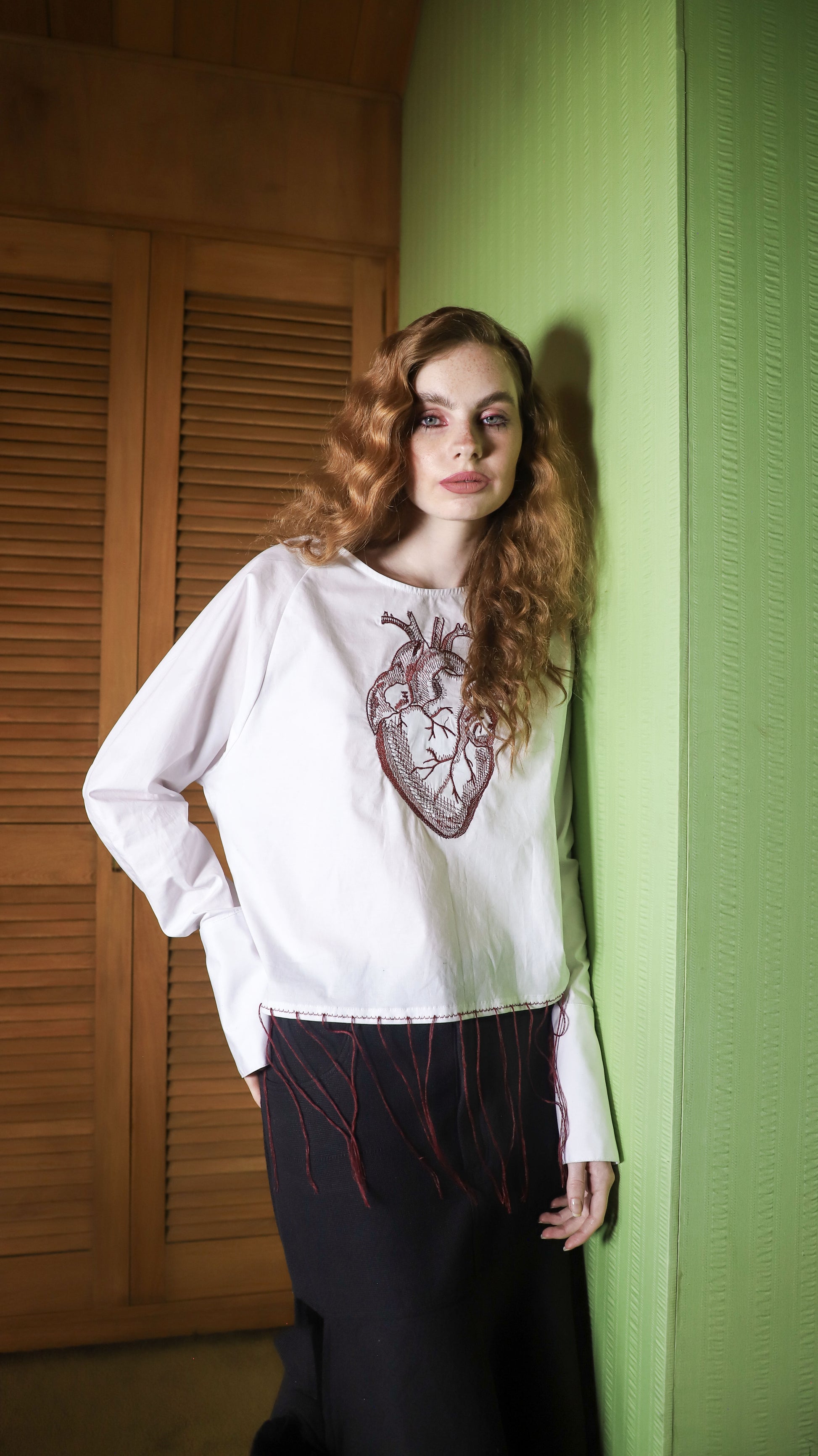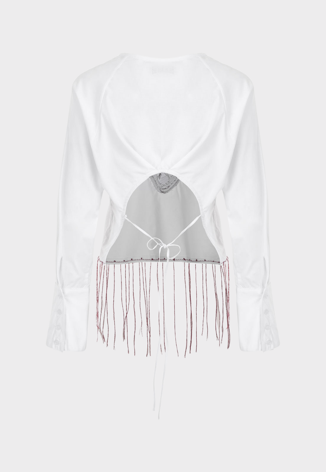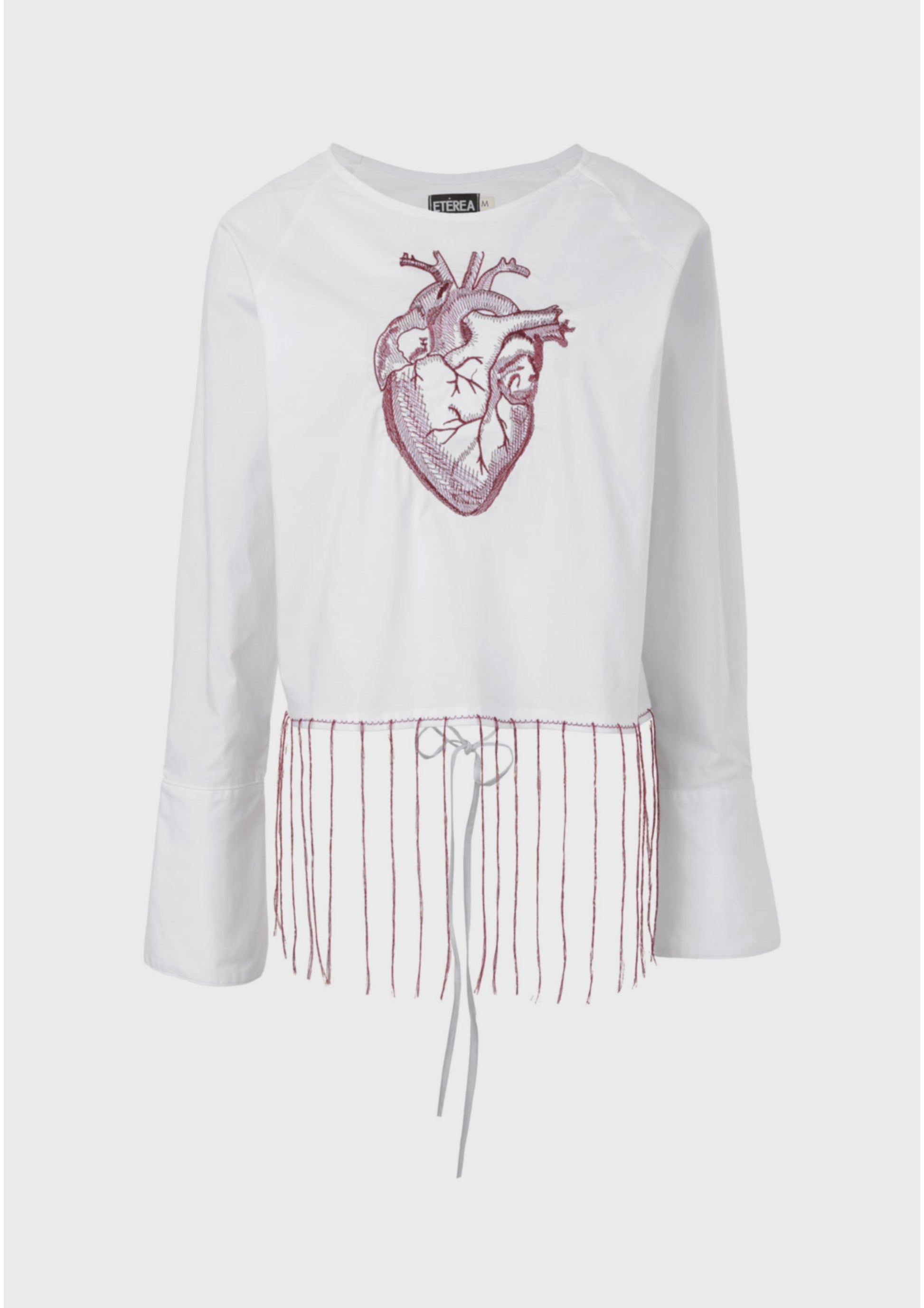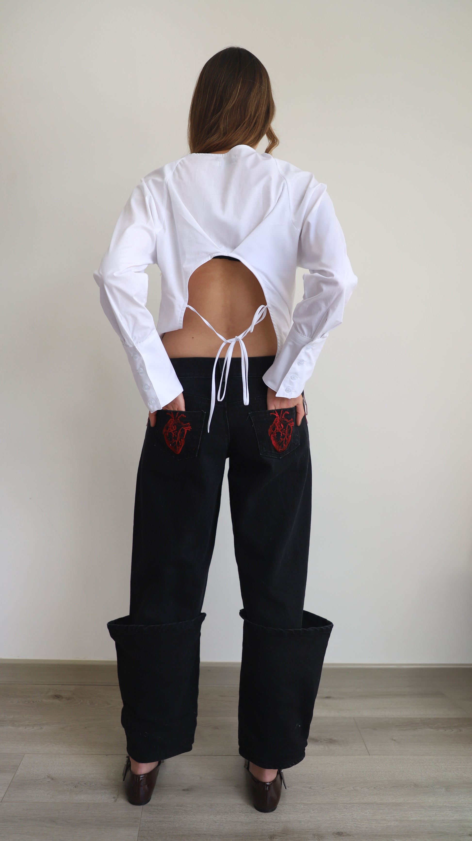 Camisa blanca con bordado de corazón anatómico en color vino, espalda descubierta con tiras para amarrar.