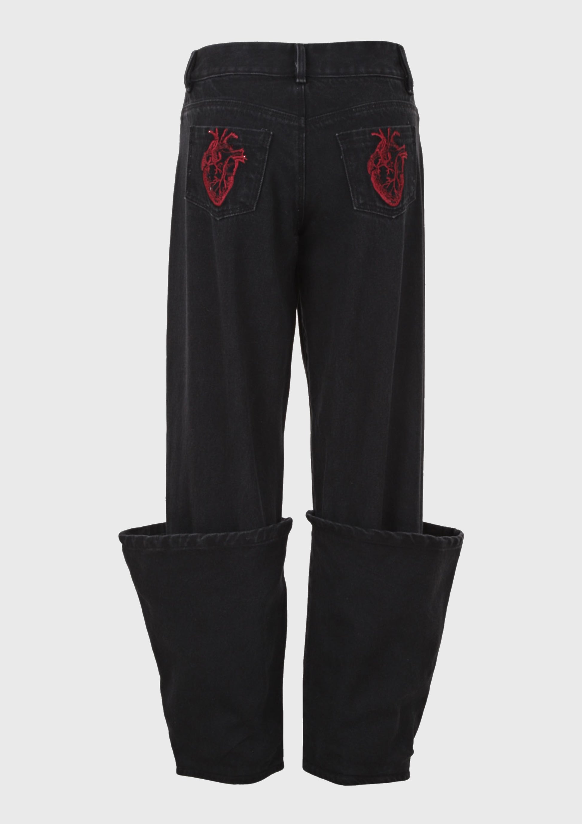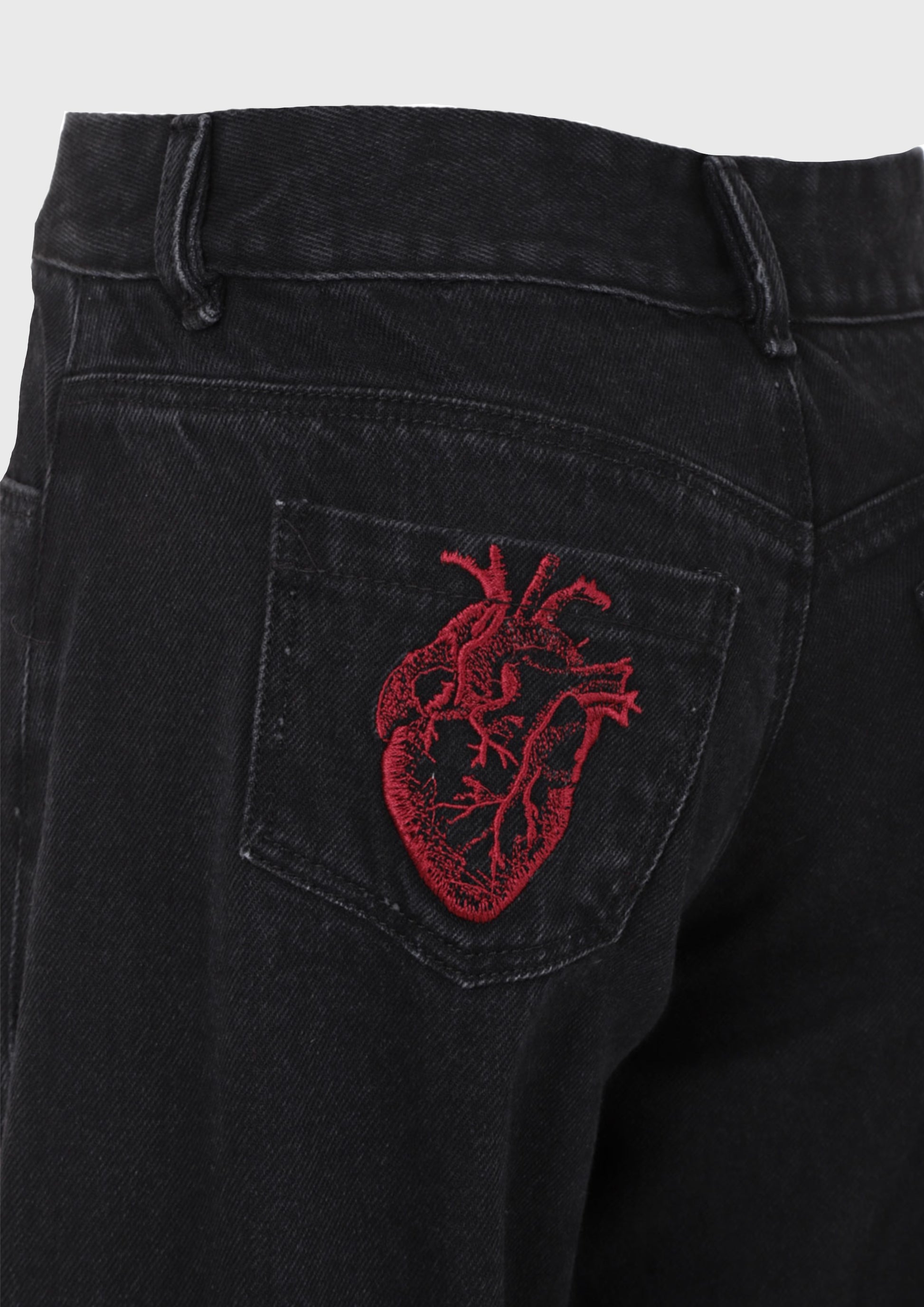 Jeans negros, corte recto con bota alta y ancha, bordado en bolsillos traseros.