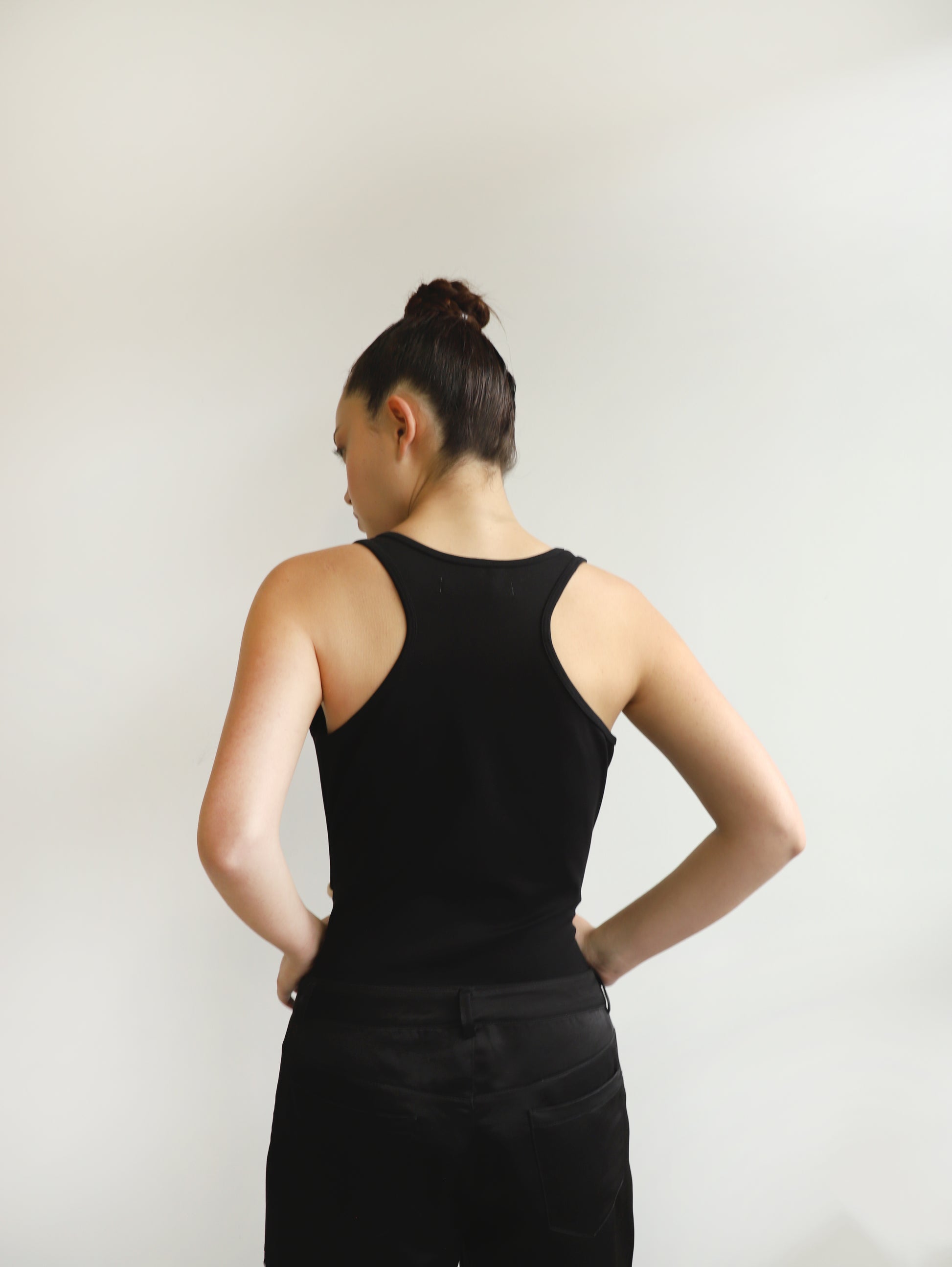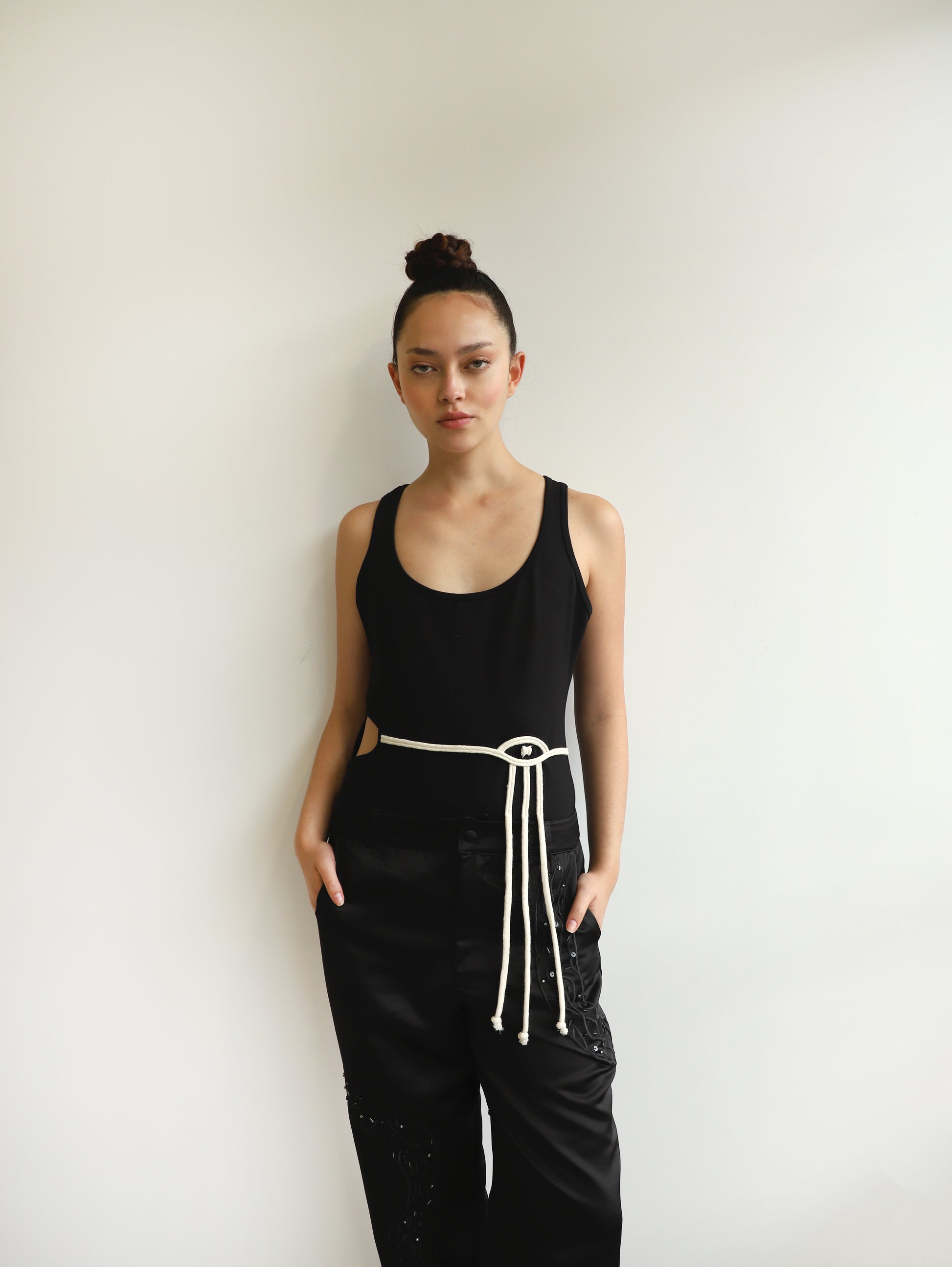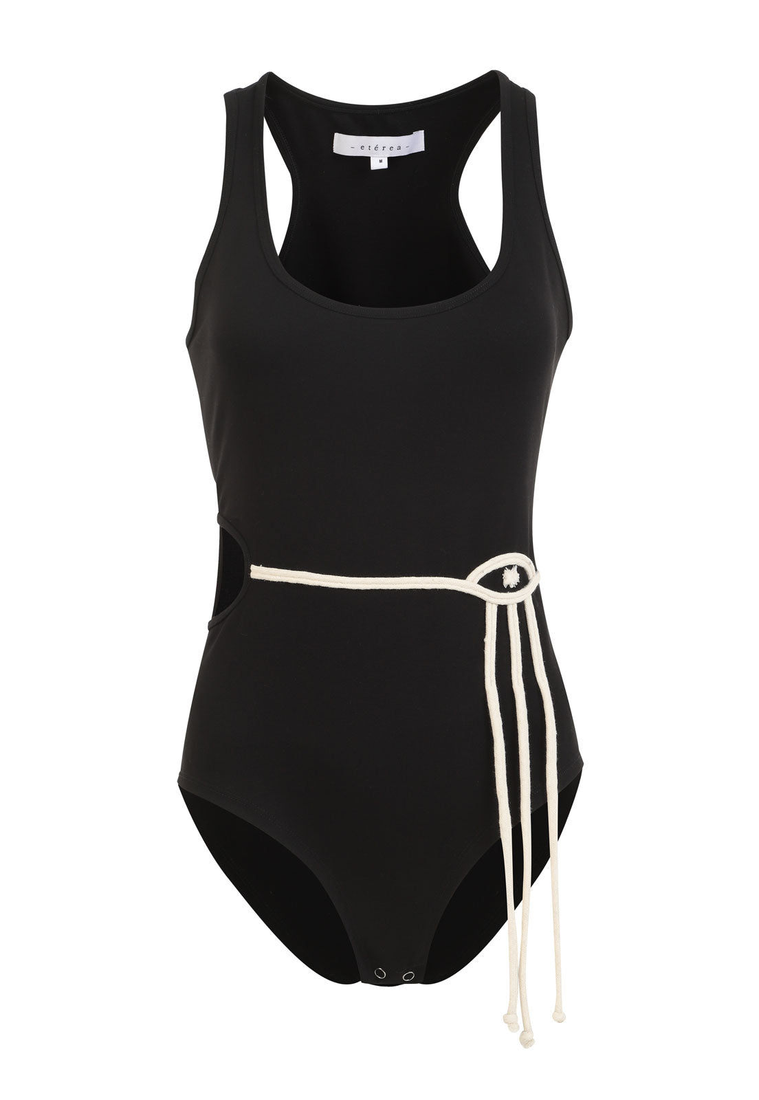 Body negro bordado a mano con cordón.